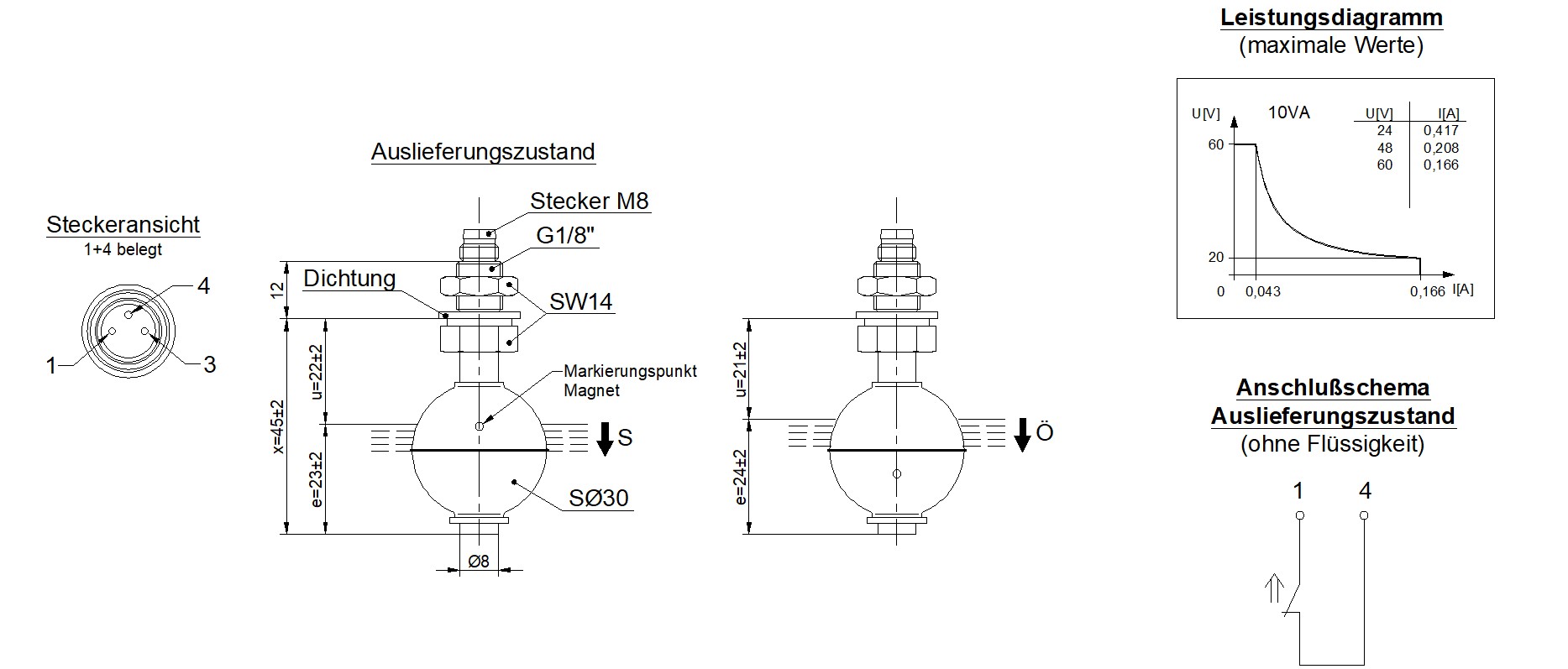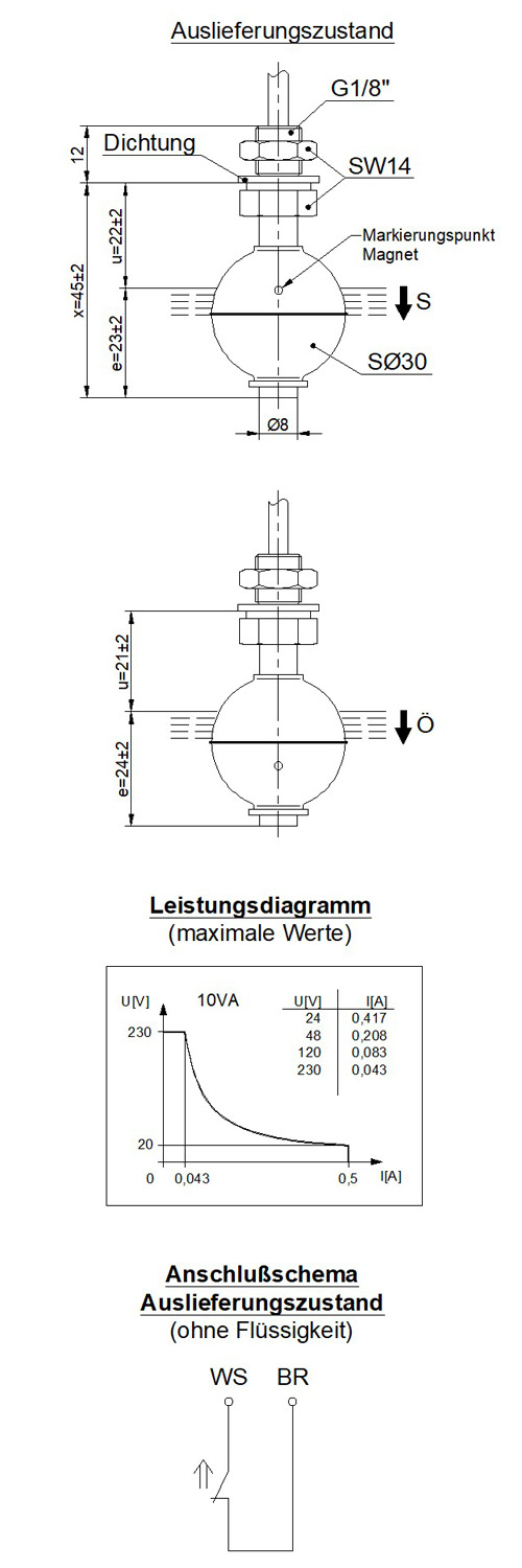 Eintauchtiefe Schwimmer: 18 mm ±2 mm (bei Dichte 1 g/cm³)