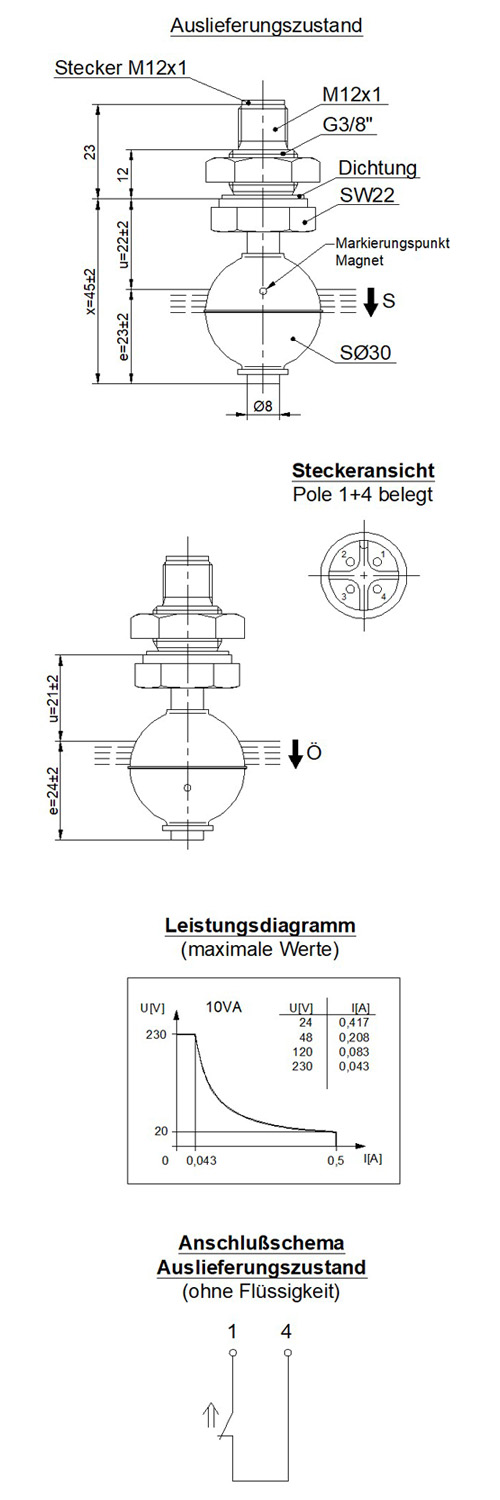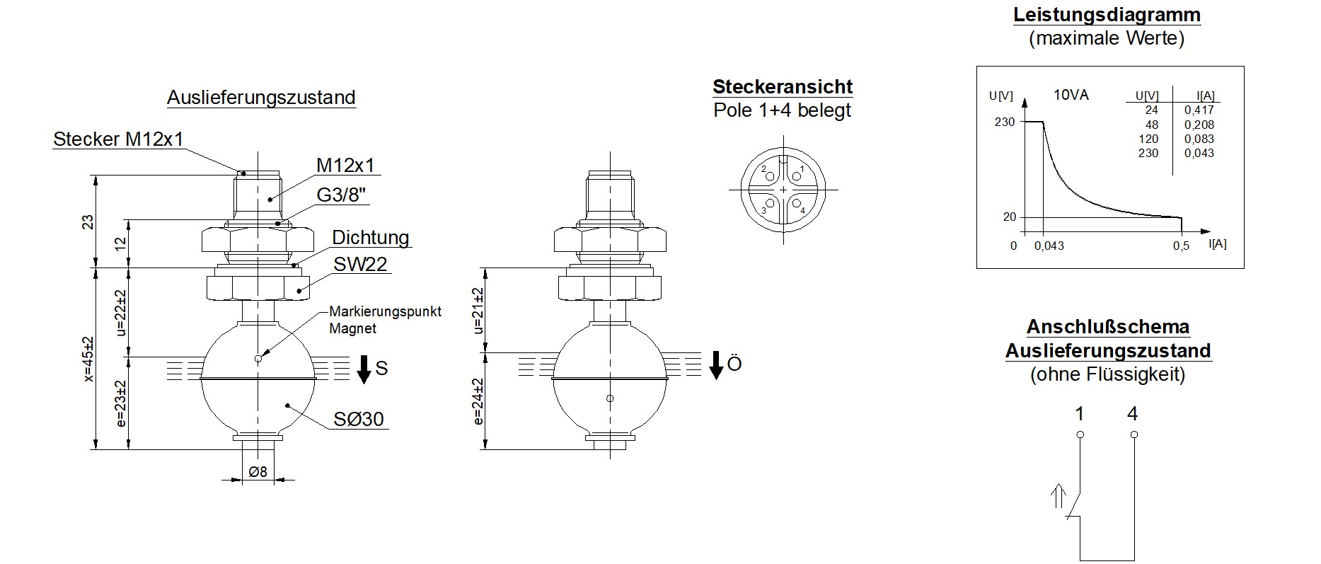 Dieser Miniatur-Schwimmerschalter mit 8 mm Schaltrohr wurde für industrielle Anwendungen entwickelt, in denen kompakte Bauform und hohe Materialbeständigkeit entscheidend sind. Das Gehäuse aus Edelstahl 1.4571 und der Schwimmer aus 1.4301 erlauben den Einsatz in anspruchsvollen Medien sowie unter erhöhtem Druck. Die zuverlässige Reed-Technik arbeitet ohne Dauerstrom und gewährleistet eine präzise, langlebige Grenzstandserfassung. Der elektrische Anschluss erfolgt direkt über einen M12-Steckverbinder, während die vertikale Montage im kombinierten M12x1 / G3/8-Innengewinde eine sichere, dichte Installation in verschiedenen Behältertypen ermöglicht.