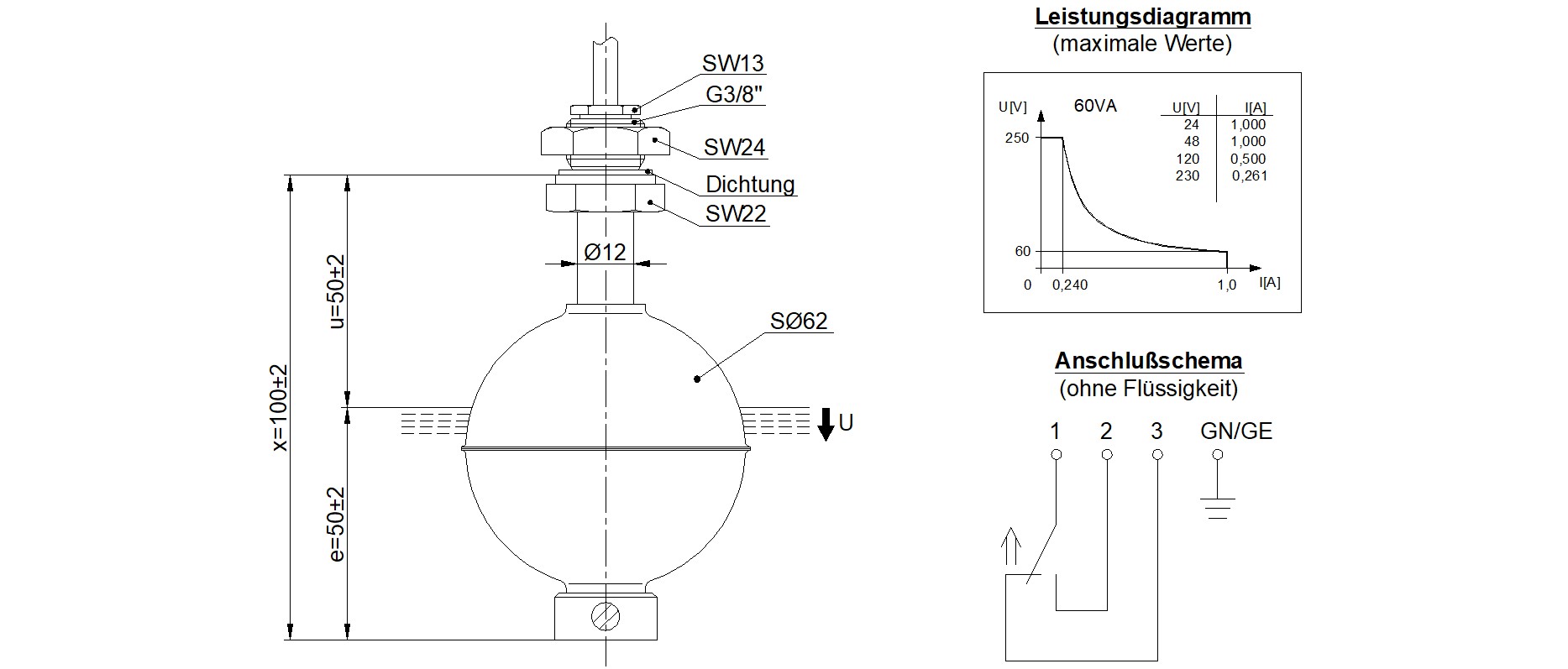 Dieser Standard-Schwimmerschalter mit Ø12 mm Schaltrohr eignet sich für industrielle Anwendungen, bei denen korrosionsbeständige Materialien und erhöhte Betriebsdrücke erforderlich sind. Gehäuse und Schwimmer bestehen vollständig aus Edelstahl 1.4571, wodurch der Sensor zuverlässig in druckbelasteten oder aggressiven Flüssigkeiten eingesetzt werden kann. Die bewährte Reed-Technik arbeitet ohne Dauerstrom und ermöglicht eine präzise und langlebige Grenzstandserfassung. Der vertikale Einbau erfolgt von innen über ein G3/8-Gewinde in Kombination mit einem PVC-Anschlusskabel.