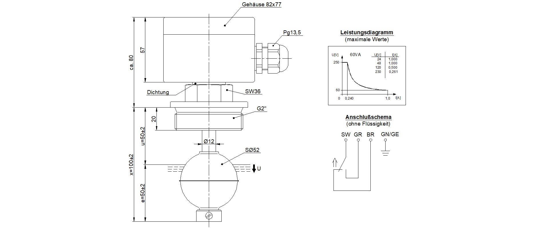 Dieser Standard-Schwimmerschalter mit Ø12 mm Schaltrohr ist für industrielle Anwendungen ausgelegt, in denen korrosionsbeständige Materialien und erhöhte Betriebsdrücke erforderlich sind. Gehäuse und Schwimmer bestehen vollständig aus Edelstahl 1.4571, wodurch der Sensor zuverlässig in aggressiven oder druckbelasteten Flüssigkeiten betrieben werden kann. Die bewährte Reed-Technik arbeitet ohne Dauerstrom und ermöglicht eine langlebige und präzise Grenzstandserfassung. Die vertikale Installation erfolgt von außen über ein G2-Gewinde.